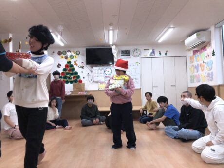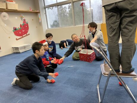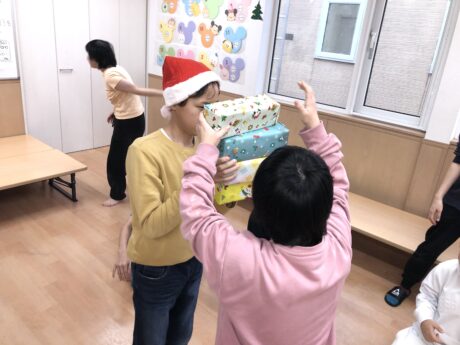 <じゃんぷDream> クリスマス会では、プレゼント積み競争をやりました‼️そーーーっと積んだプレゼントを運び歩くことがとても難しかったようです😁また、ビンゴゲームでは選ばれた数字を探し、間違えないように開けていました😙とても盛り上がっていました☺️